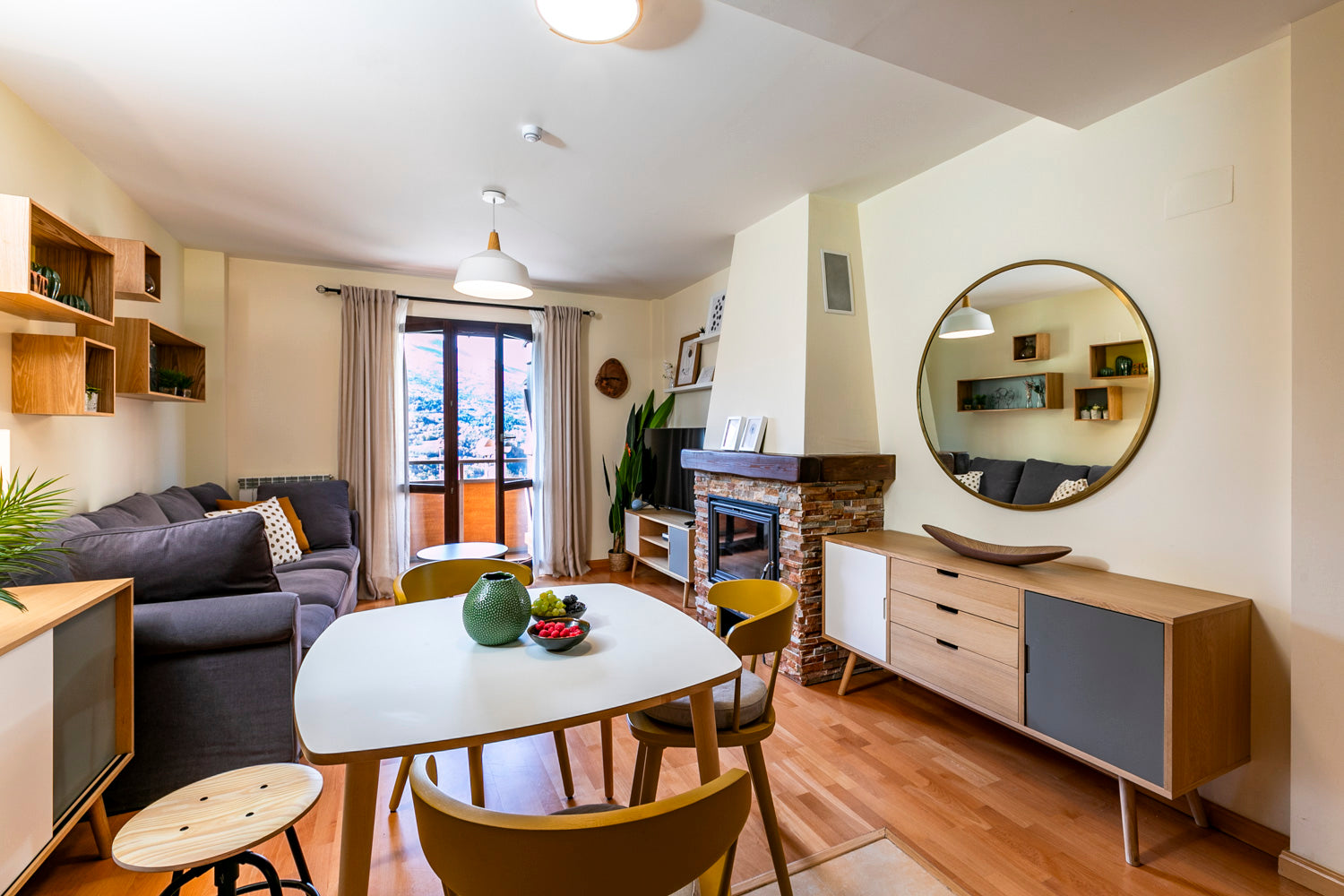 Dúplex rústico-chic con jardín vallado en el Barrio de Santiago, Villanúa, Pirineo Aragonés. Planta baja: salón-comedor con chimenea y Smart TV, cocina completa y salida directa al Jardín.
