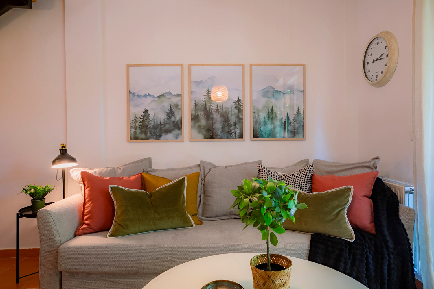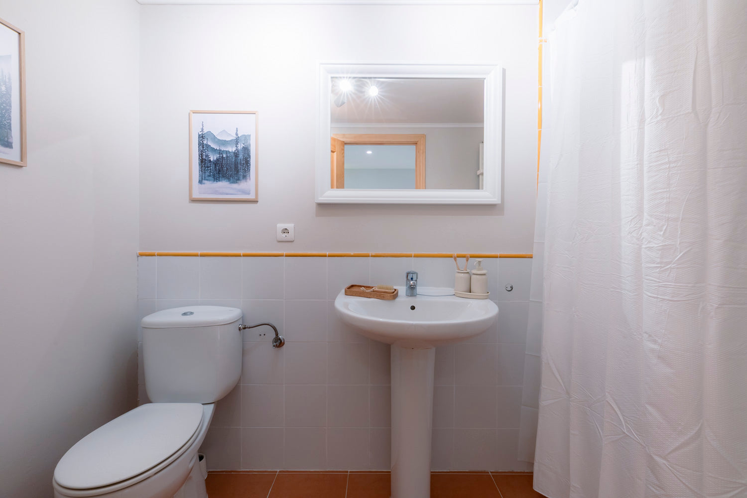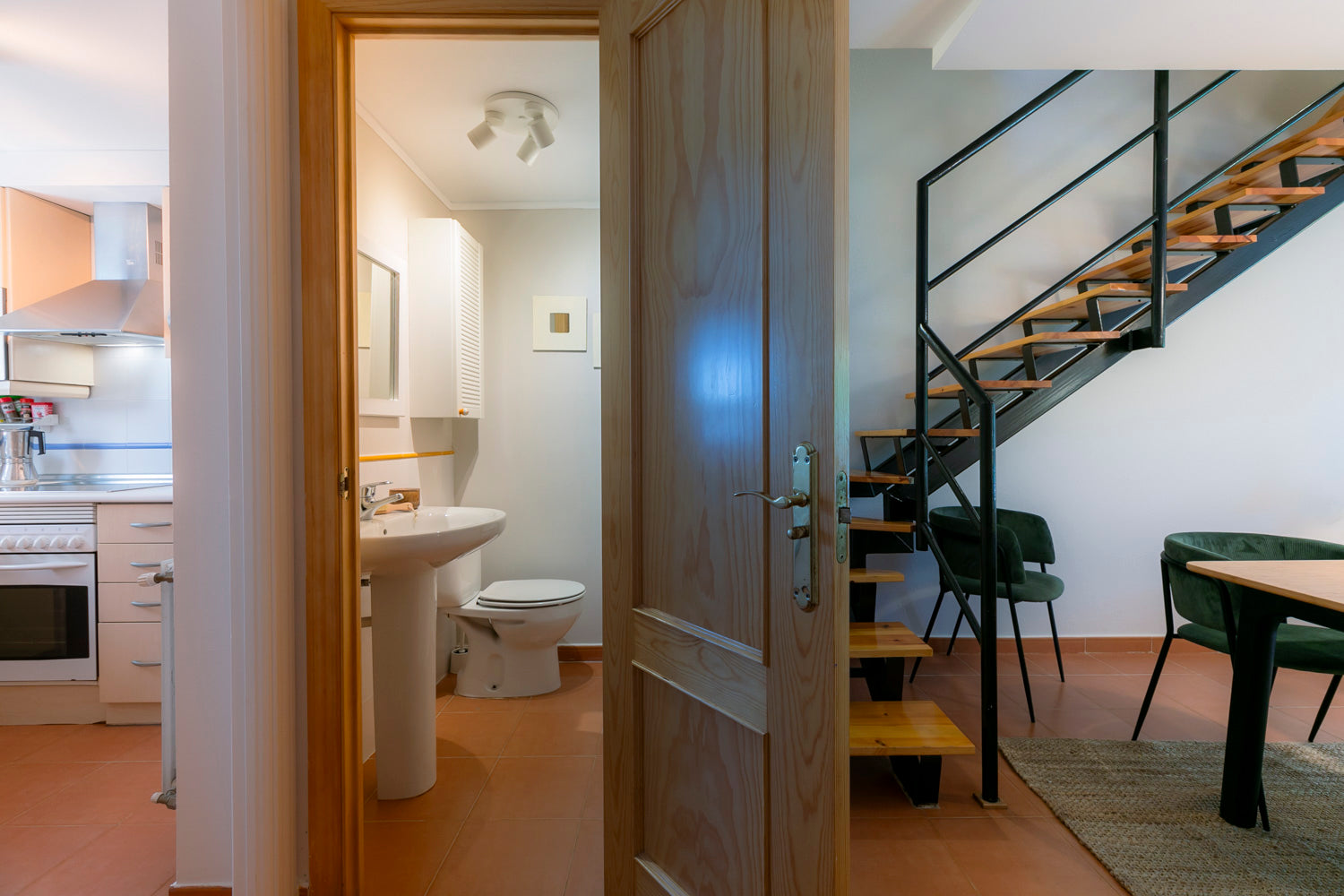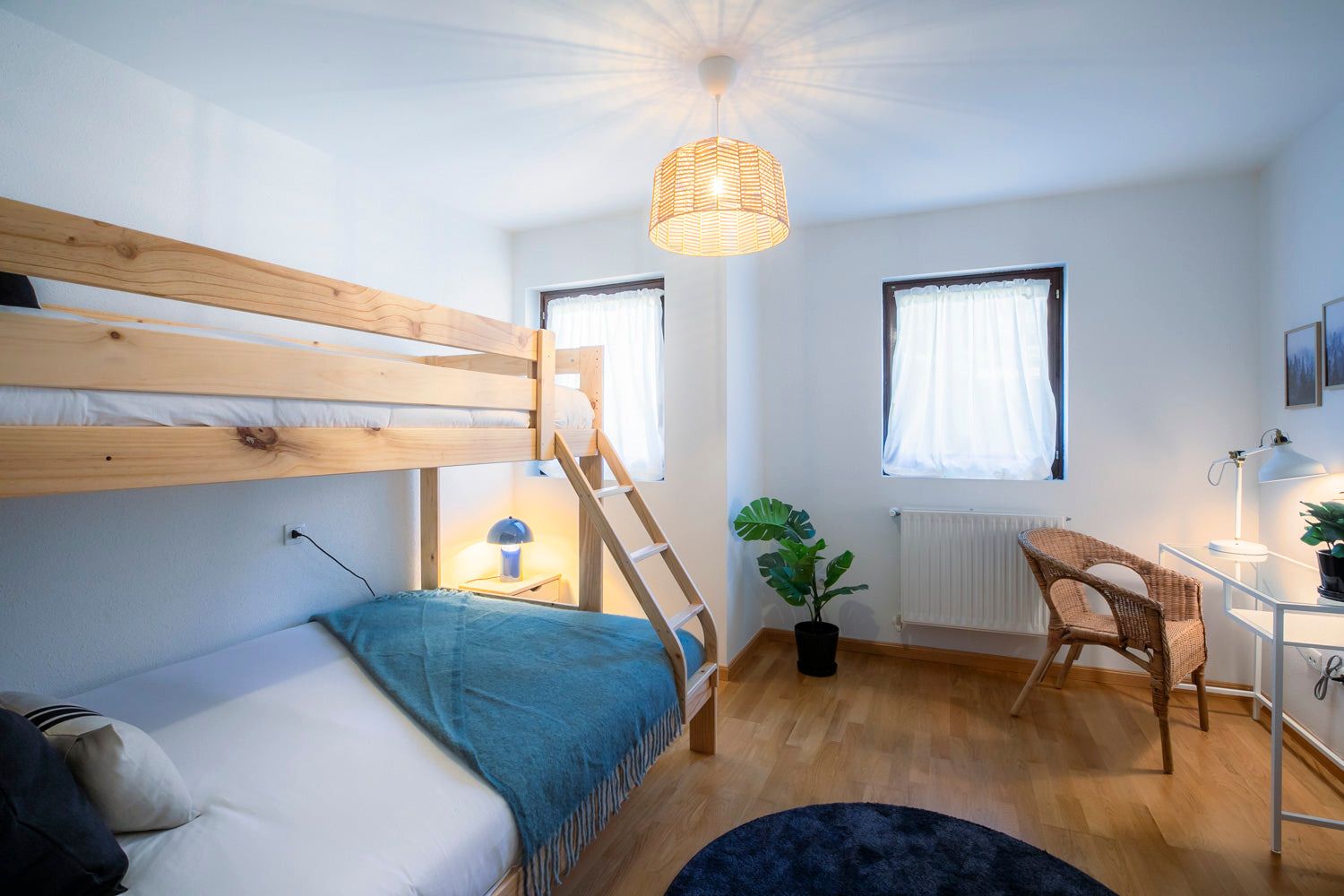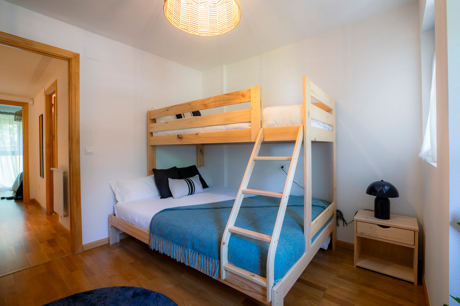 Planta alta: dos dormitorios (ambos con cama queen; uno incluye litera) y baño completo. Sofá-cama en el salón para huéspedes extra.