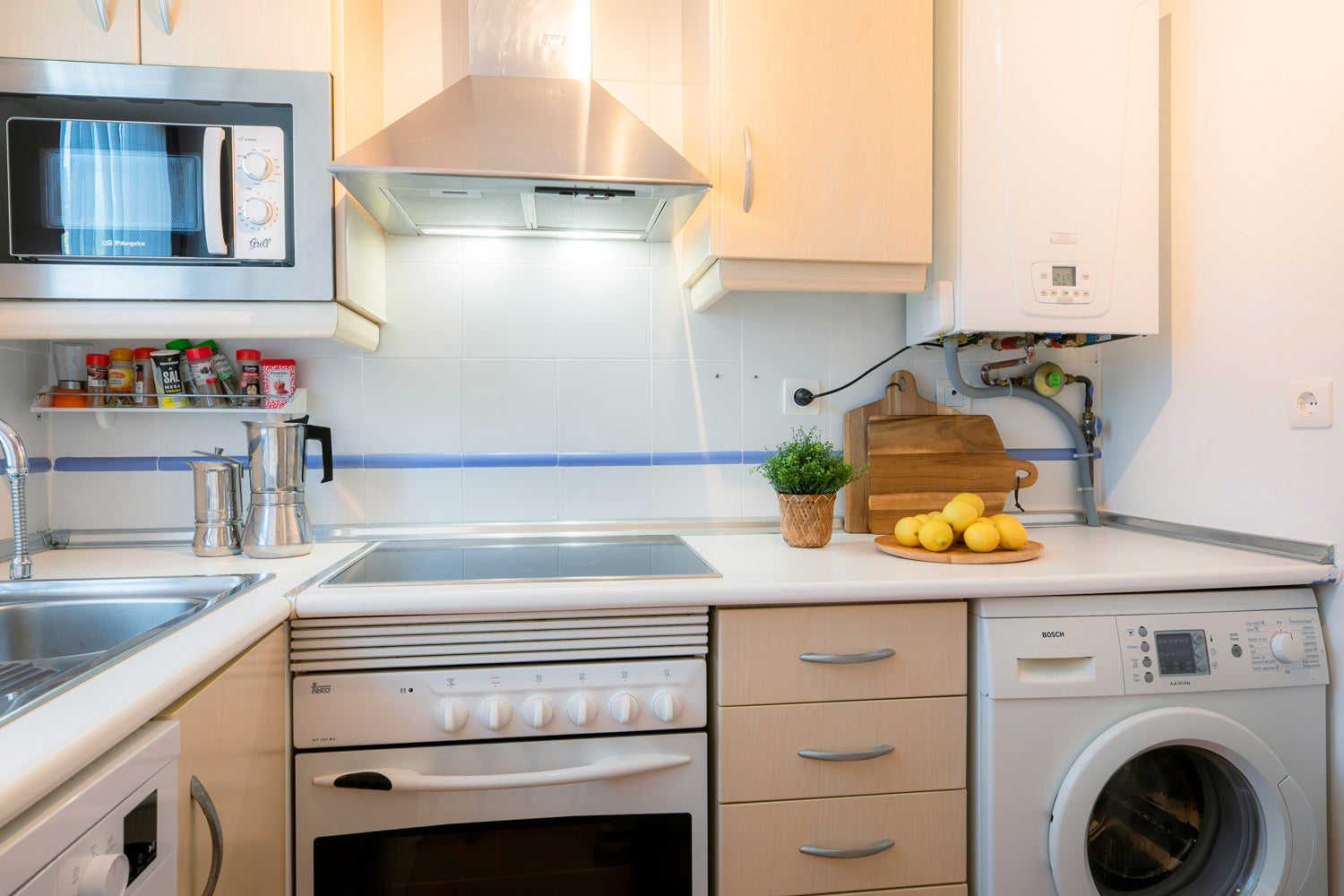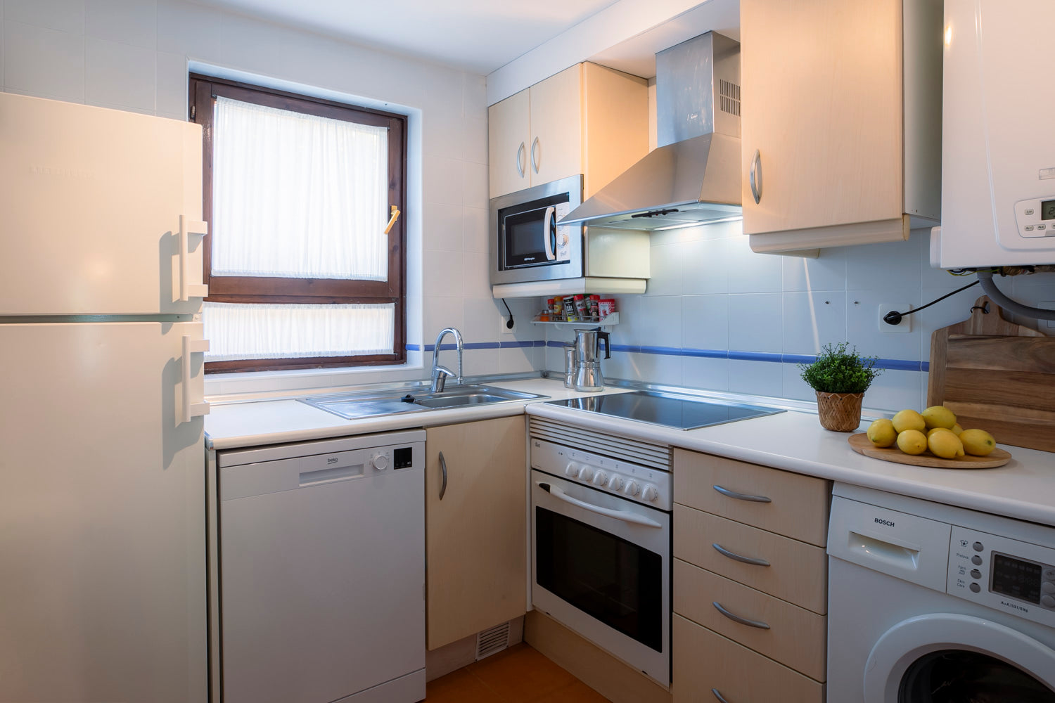 Cocina completa: vitro, horno, micro, lavavajillas, cafetera italiana, menaje completo.