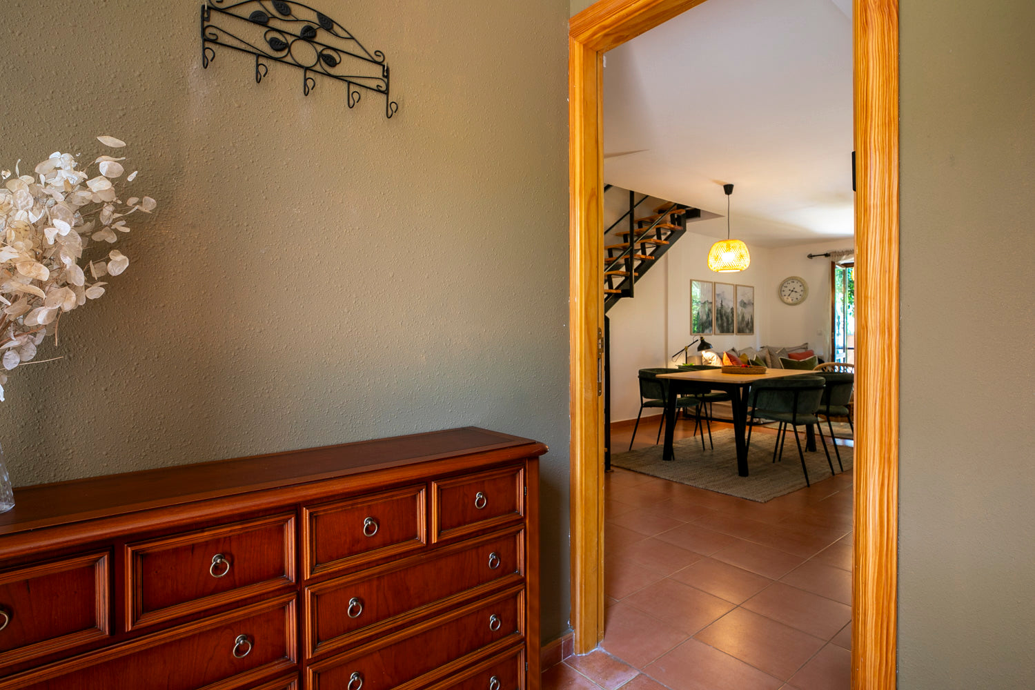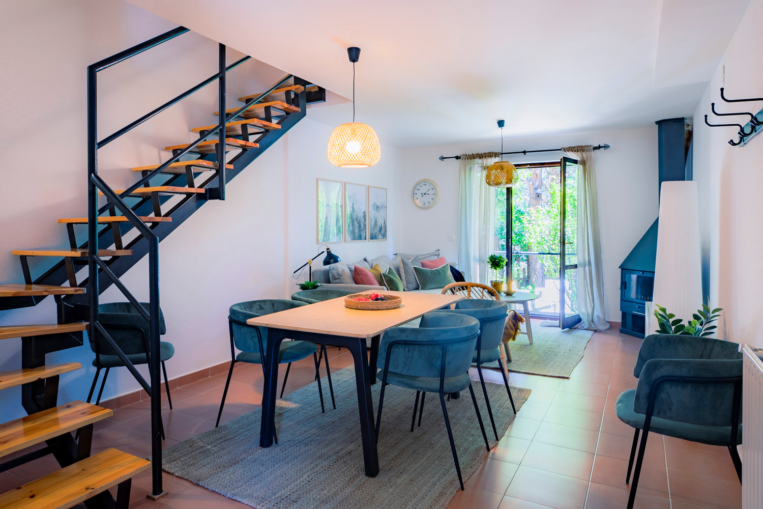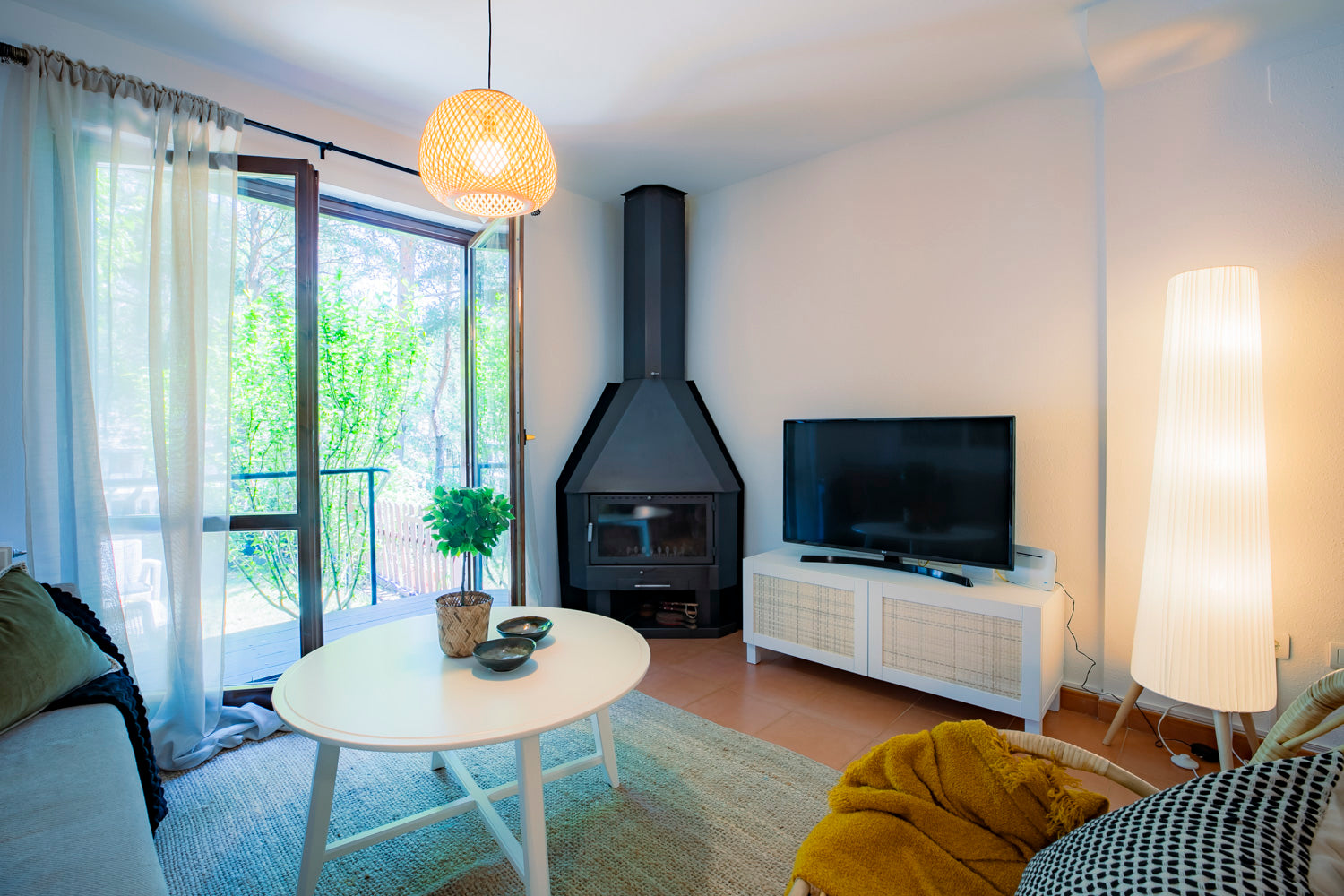 Planta baja: salón-comedor con chimenea, cocina abierta totalmente equipada y acceso directo al jardín vallado.