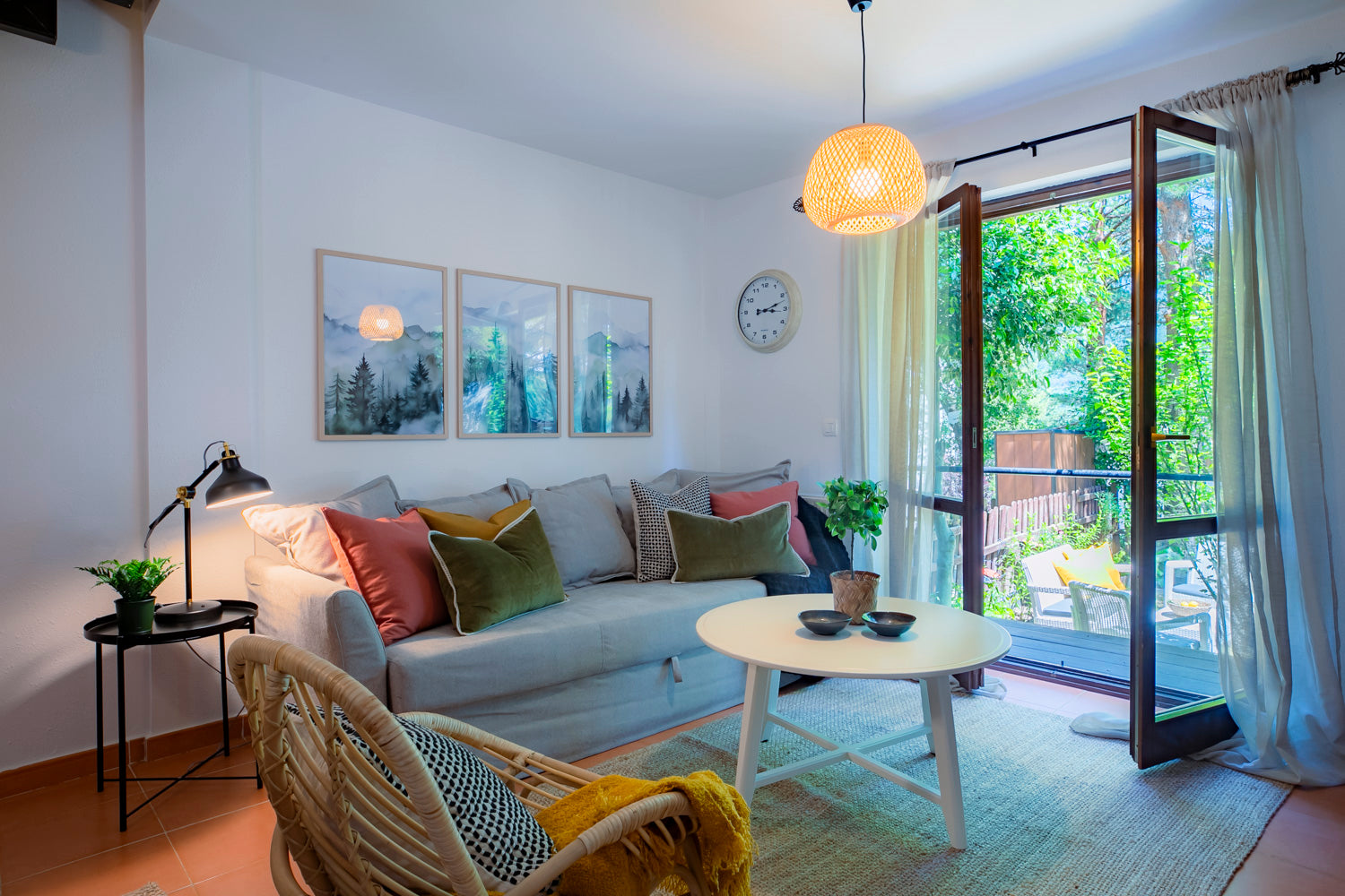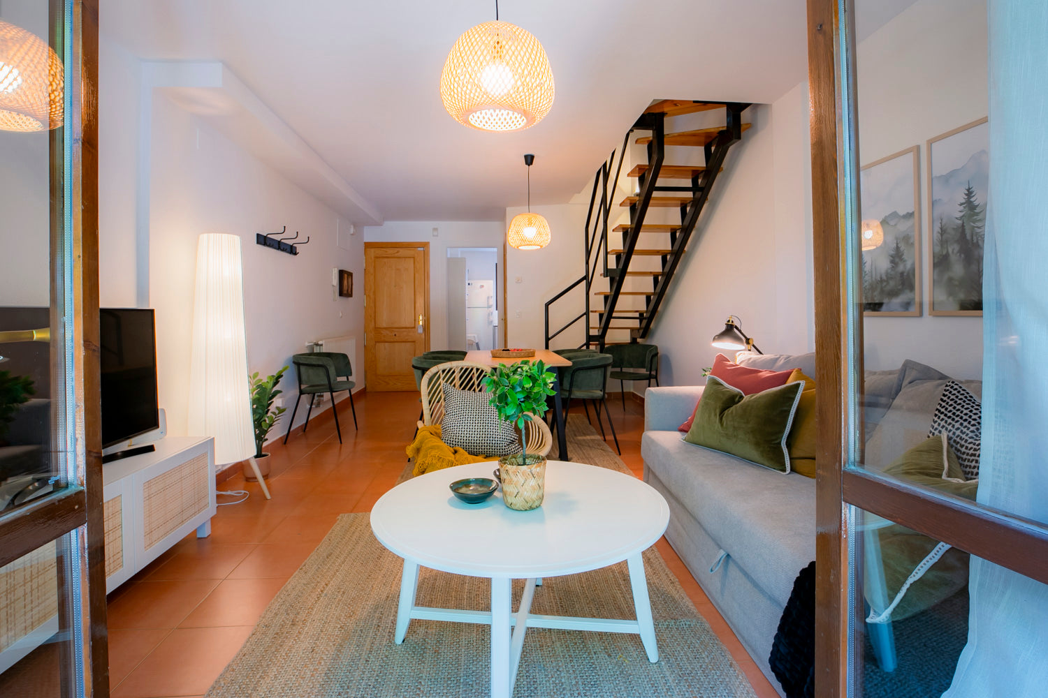 Dúplex rústico-chic con jardín vallado en el Barrio de Santiago, Villanúa, Pirineo Aragonés. Planta baja: salón-comedor con chimenea y Smart TV, cocina completa y salida directa al Jardín.