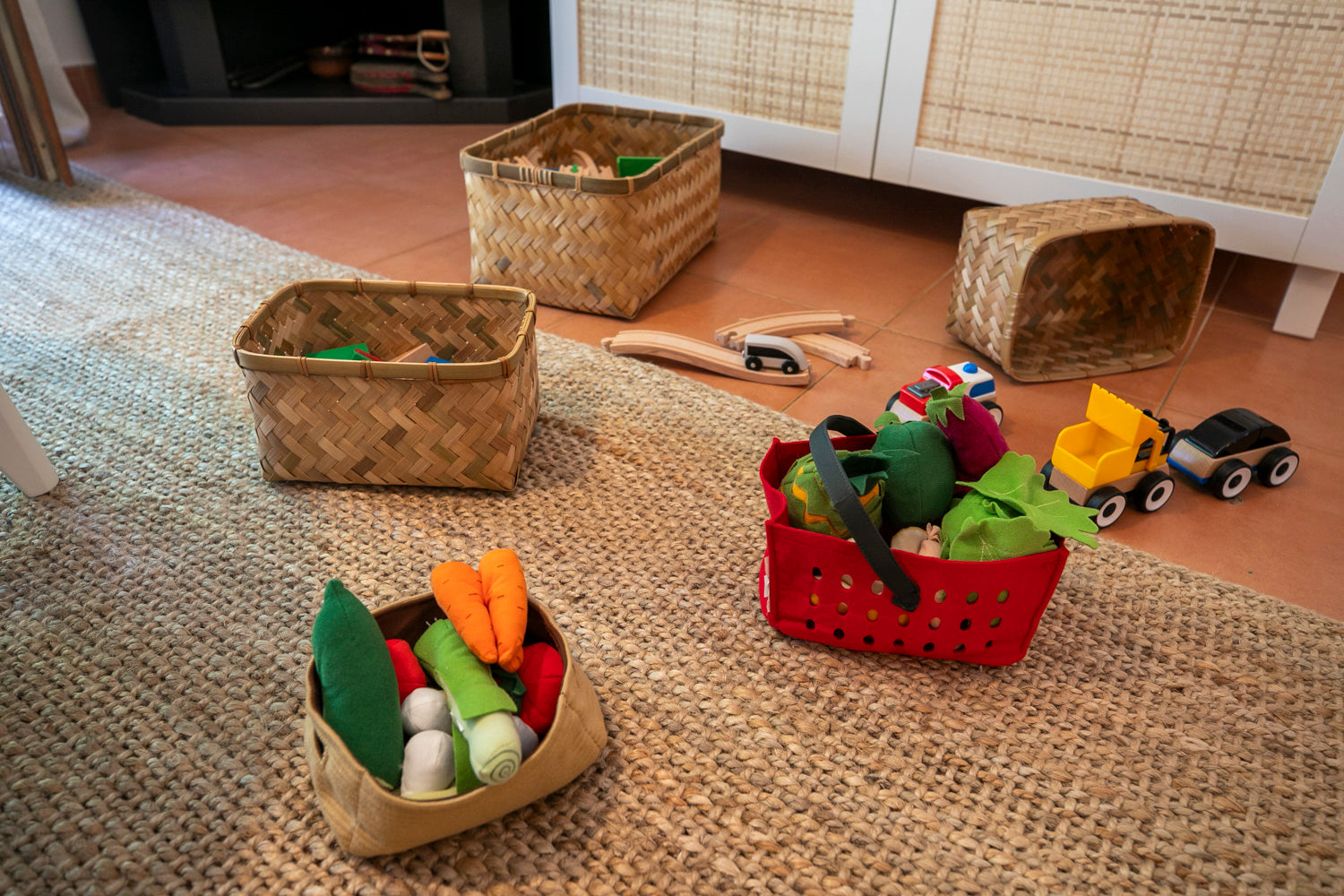 Cuna plegable, trona, juguetes y juegos de mesa.